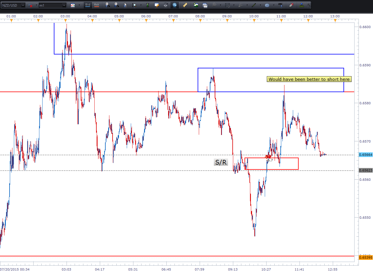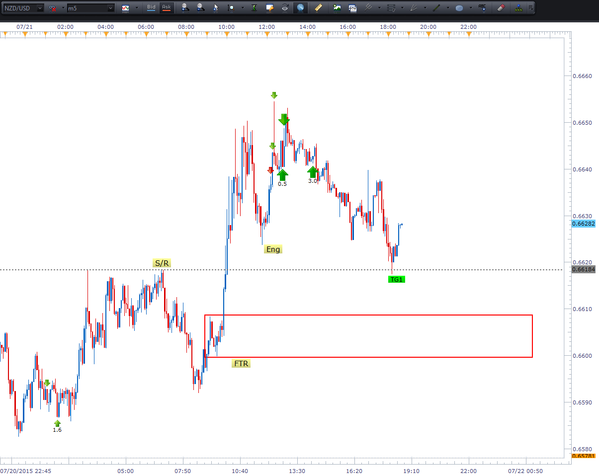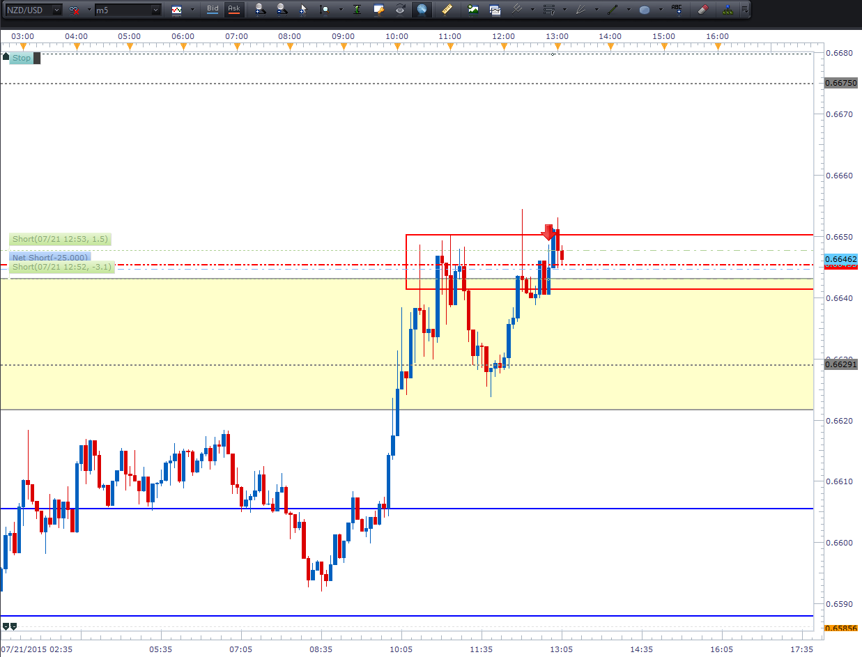 اچ : این یه مثال از یه معاملهی بینتیجهای هست که صبح انجام دادم. دیدم قیمت تو یه تایمفریم کوتاه داره به یه سطح حمایت/مقاومت نزدیک میشه، و یه پوزیشن شورت گرفتم. حد ضررم خیلی تنگ بود، و فقط به خاطر اینکه جفت ارز NZD/USD این چند وقت خیلی نزولی بوده این معامله رو انجام دادم، اگه سطح واکنش نشون میداد، یه مدت تو معامله میموندم .