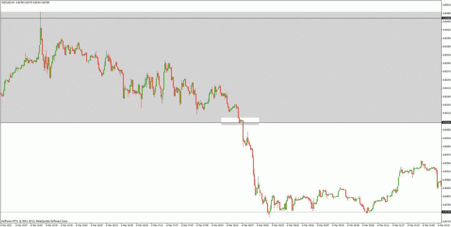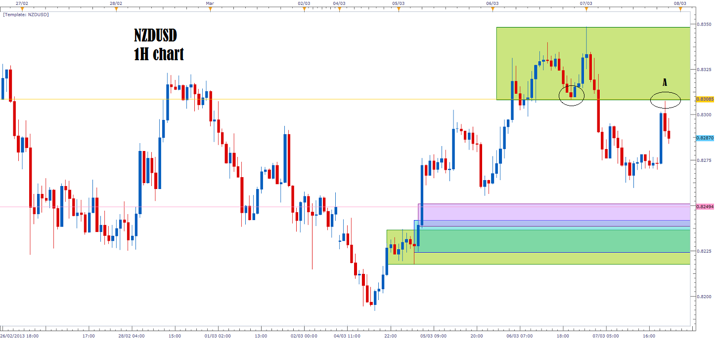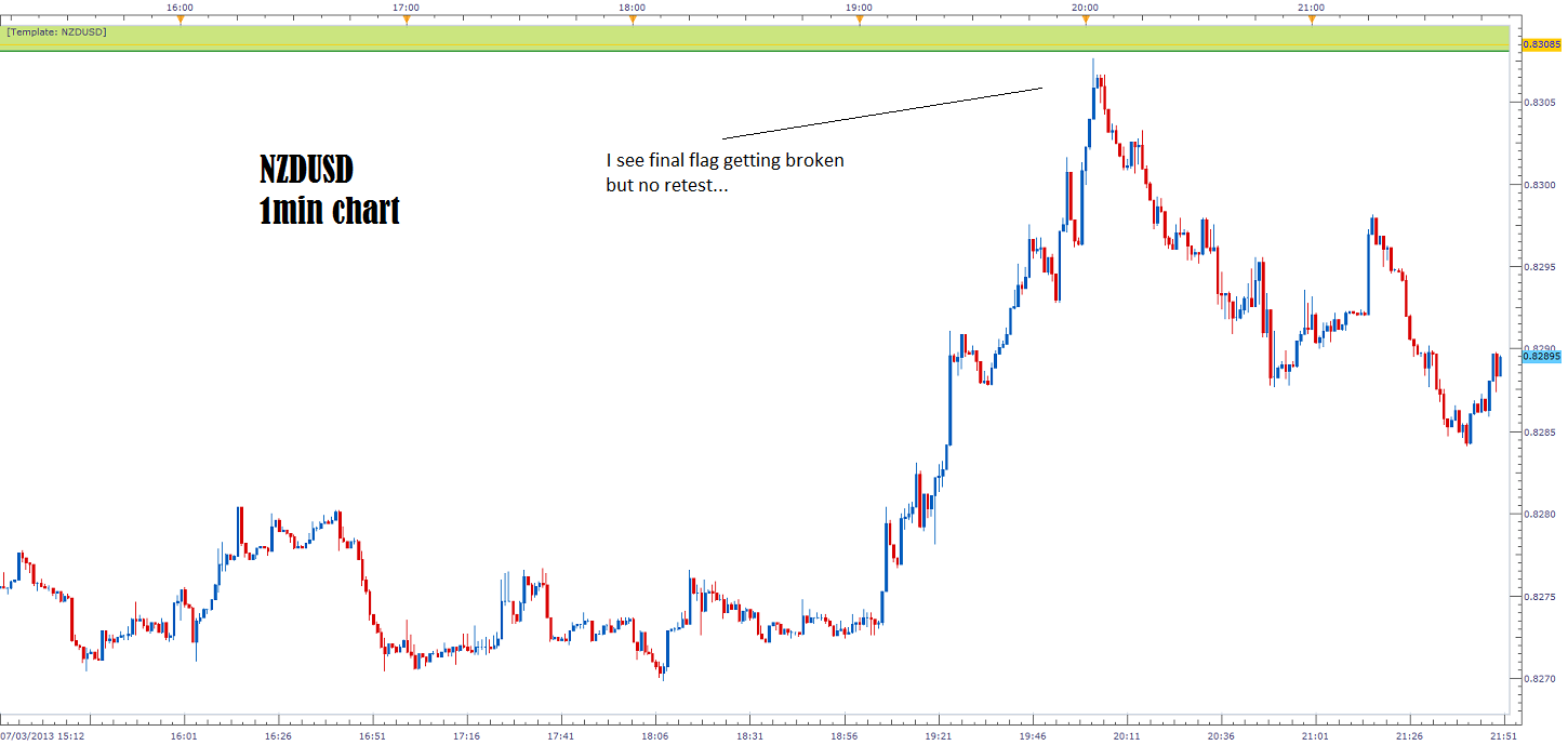 سایر اعضا : سلام ایف منتظر بودم NZDUSD به ناحیهای که تو چارت 1 ساعته A نام گذاشته بودم برسه تا دنبال فرصت فروش بگردم. بعد از اینکه پرچم تو چارت 1 دقیقهای شکست، منتظر یه تست مجدد یا یه فشردگی کوتاه به سمت عرضه جدید بودم ولی هیچ کدوم اتفاق نیفتاد. جفت ارز 23 پیپ تو جهتی که قصد داشتم معامله کنم حرکت کرد، پس فرصت کاملا از بین رفته. نمیدونم اگه شما بودید این معامله رو انجام میدادید یا نه. ولی اگه انجام میدادید، ورودتون کجا بود؟ آیا یه الگوی قیمتی خاصی تو چارت 1 دقیقهای وجود داشت که من از دست دادم و نشون میداد قیمت برای تست مجدد برنمیگرده ؟