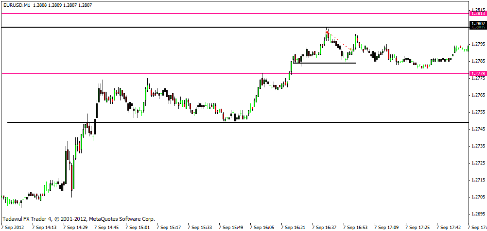 مل : امروز یه اسکلپ سریع روی یورو دلار زدم. +10 پیپ، روز شلوغی بود و نتونستم زودتر پست بذارم. دلیل معامله این بود: -ناحیه عرضه 4 ساعته که فرش نبود اما با یک سوییپ روزانه روی USDX همزمان بود. -عدد رند بزرگ -اکشن قیمت روی تایم فریم 1 دقیقه میدونستم که اسکلپ خواهد بود چون ناحیه تقاضای تازهای وجود داشت که در مسیر صعود در تایم فریمهای پایینتر شکل گرفته بود (برای مثال 1.2780) .
