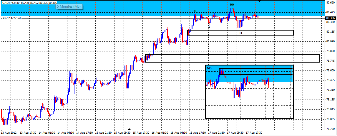 راجع به واکنش، معمولا دوست دارم توی یه سطح، حرکت‌های سریع ببینم، ولی ممنون از بچه‌های خوب اینجا تو AG که یاد گرفتنن نشونه‌های دیگه ای هم هست که نشون میده یه سطح ممکنه نگه داره یا نه. اینجا واکنش خاصی نیست، ولی دارم فکر می‌کنم شاید یه QM باشه؟ (اینا انقدر شکل و اندازه‌های مختلف دارن!) یه سطح دیگه هم تو M5 هست که هایلایت کردم و ممکنه قیمت رو پایین نگه داره، و شکستن این سطح می‌تونه فرصتی برای کم کردن ضررهام باشه.