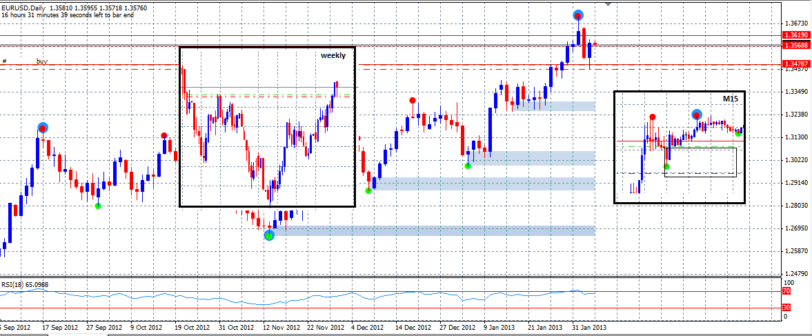 پدینی : خب برگشتم و خیلی هم آمادهام که دوباره یه عضو فعال و مشتاق باشم! به مناسبت شروع دوباره، اینم معاملهی EU. این یه چارت D (روزانه) هست که خیلی قشنگ نشون میده قیمت چطور به تقاضا چسبیده، و همچنین چطور به یه منطقهی چرخش هفتگی (FLIP ZONE ) واکنش نشون داده. معاملهی من دقیقاً روی اون اینگلف ۱۵ دقیقهای مشخص شده بود، و خیلی به حد ضررم نزدیک شد.