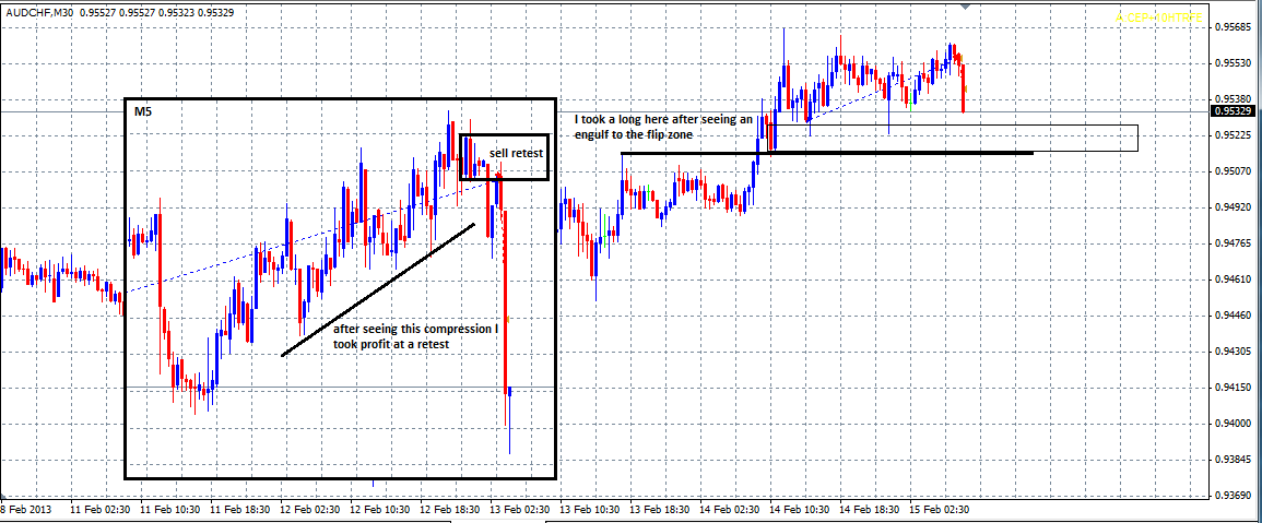 پدینی : کمی نتیجه متفاوت در معامله AUDCHF من ، اما باید با شرایط بازار سازگار شد . این معامله پس از آن انجام شد که من یک اینگلف ( engulf ) دیدم که یک منطقه برگشتی ( flip zone ) را در M15 تست کرد . هدف بالاتر بود ، اما پس از دیدن مقداری فشردگی ( compression ) و یک شکست کوچک ، من سود را در آزمایش مجدد ( retest ) گرفتم و یک اسکالپ کوتاه سریع ( quick scalp short ) انجام دادم !